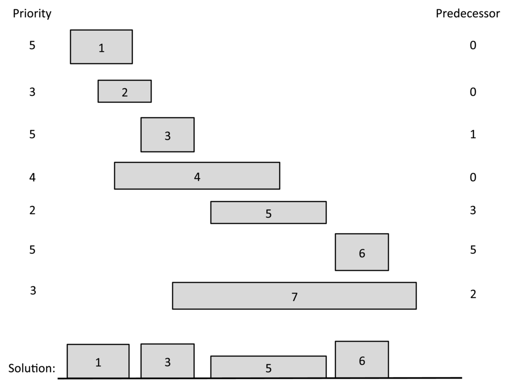 Figure 1: The telescope scheduling problem. The left and right boundary of each rectangle represent the start and finish times for an observation request. The height of each rectangle represents its benefit. We list each request’s benefit on the left and its predecessor on the right. The requests are listed by increasing finish times. The optimal solution has total benefit 17 = 5+ 5+ 2+ 5.